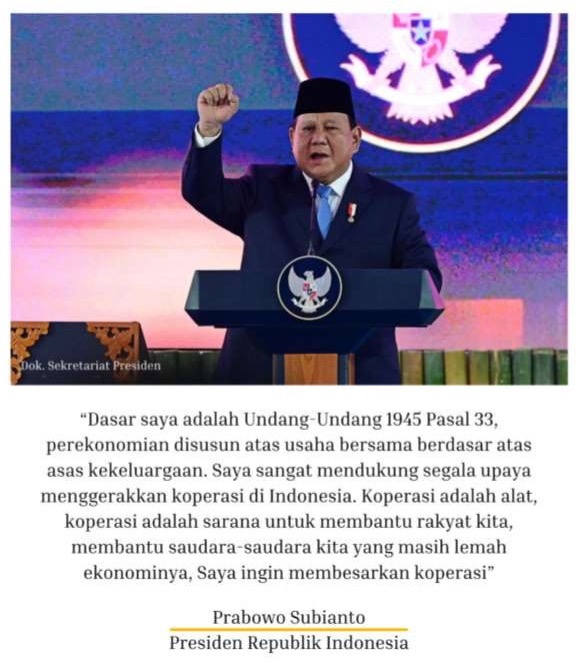 Untuk mewujudkan amanat Pasal 33 ayat (1) dan dalam upaya menciptakan perekonomian nasional yang inklusif dan berkeadilan, Presiden Republik Indonesia, Prabowo Subianto, telah memberikan arahan kebijakan strategis untuk mendukung penguatan koperasi sebagai pilar pemberdayaan ekonomi berbasis kekeluargaan dan gotong royong yang diwujudkan melalui pembentukan 80.000 (delapan puluh ribu) Koperasi Desa/Kelurahan Merah Putih.
